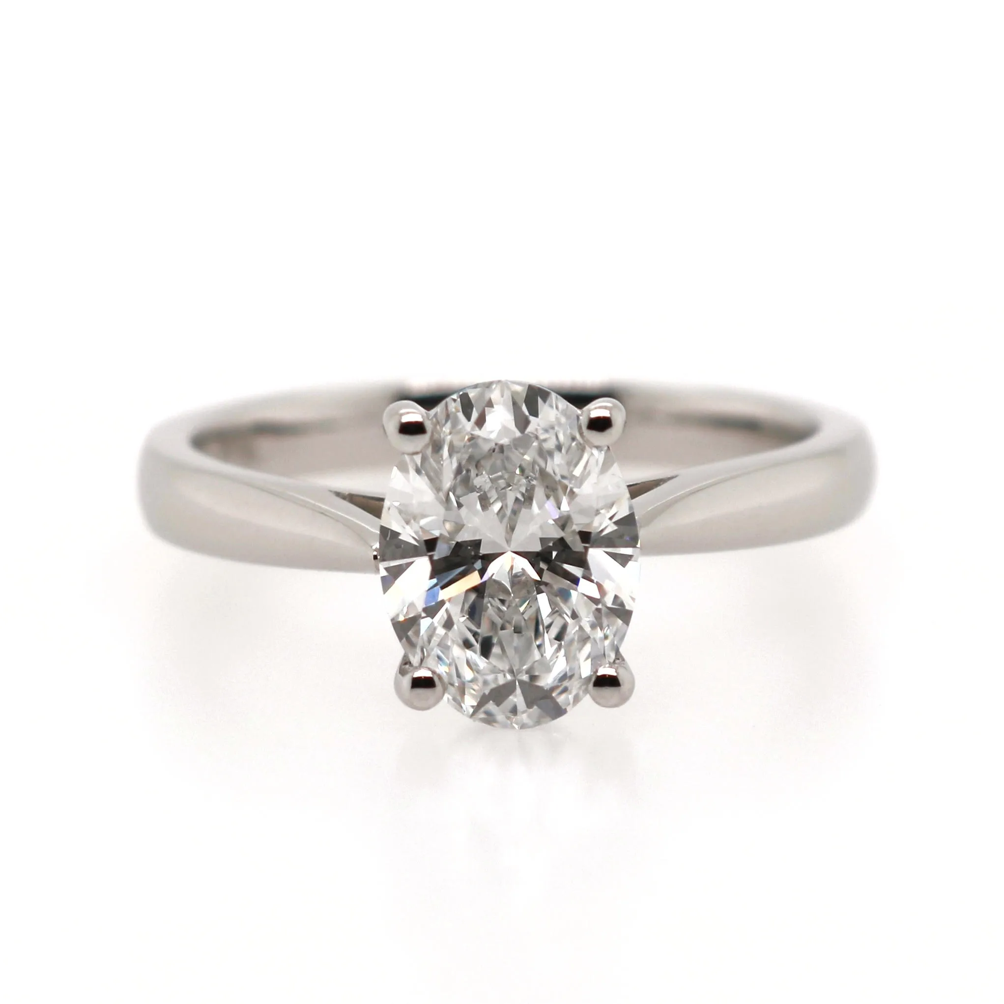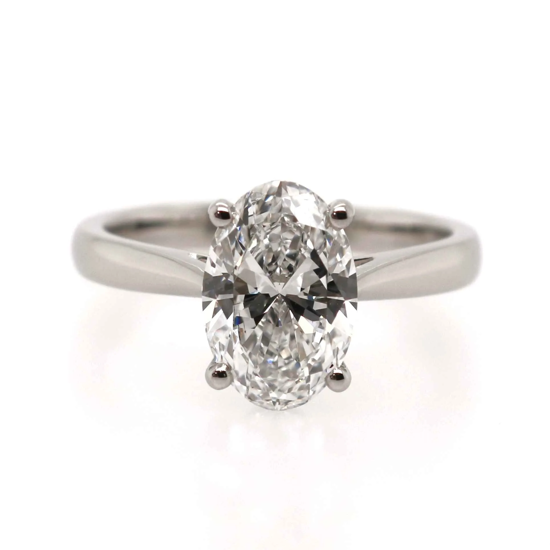 A modern but timeless laboratory grown diamond solitaire engagement ring with a 2.01ct diamond. The diamond is claw set showing the diamond from all angles. Showcasing a wed-fit shank which will allow a wedding or eternity ring to sit perfectly next to this engagement ring.Metal: platinum